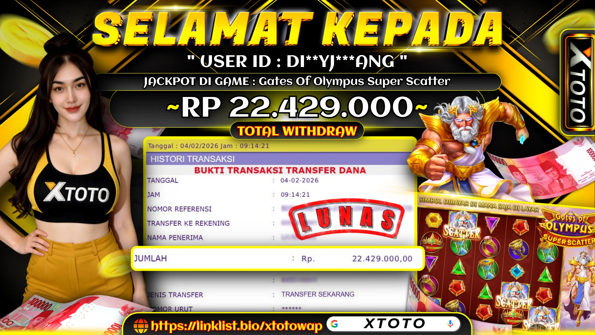 Selamat kepada DI*******ANG karena telah memenangkan jackpot senilai Rp. 22,429,000