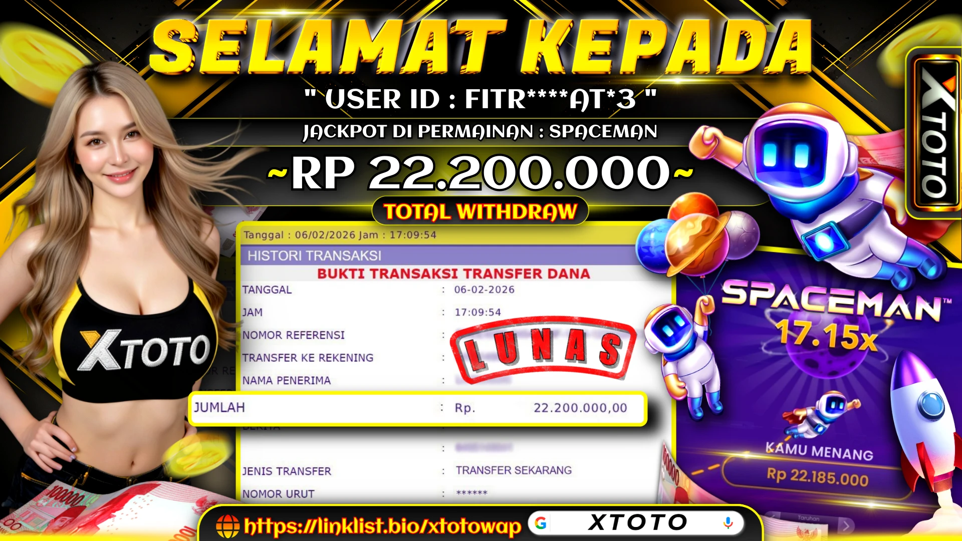 Lihat DetailXTOTO | MENANG SLOT SPACEMAN 22,200,000 LUNASS ⚡⚡⚡