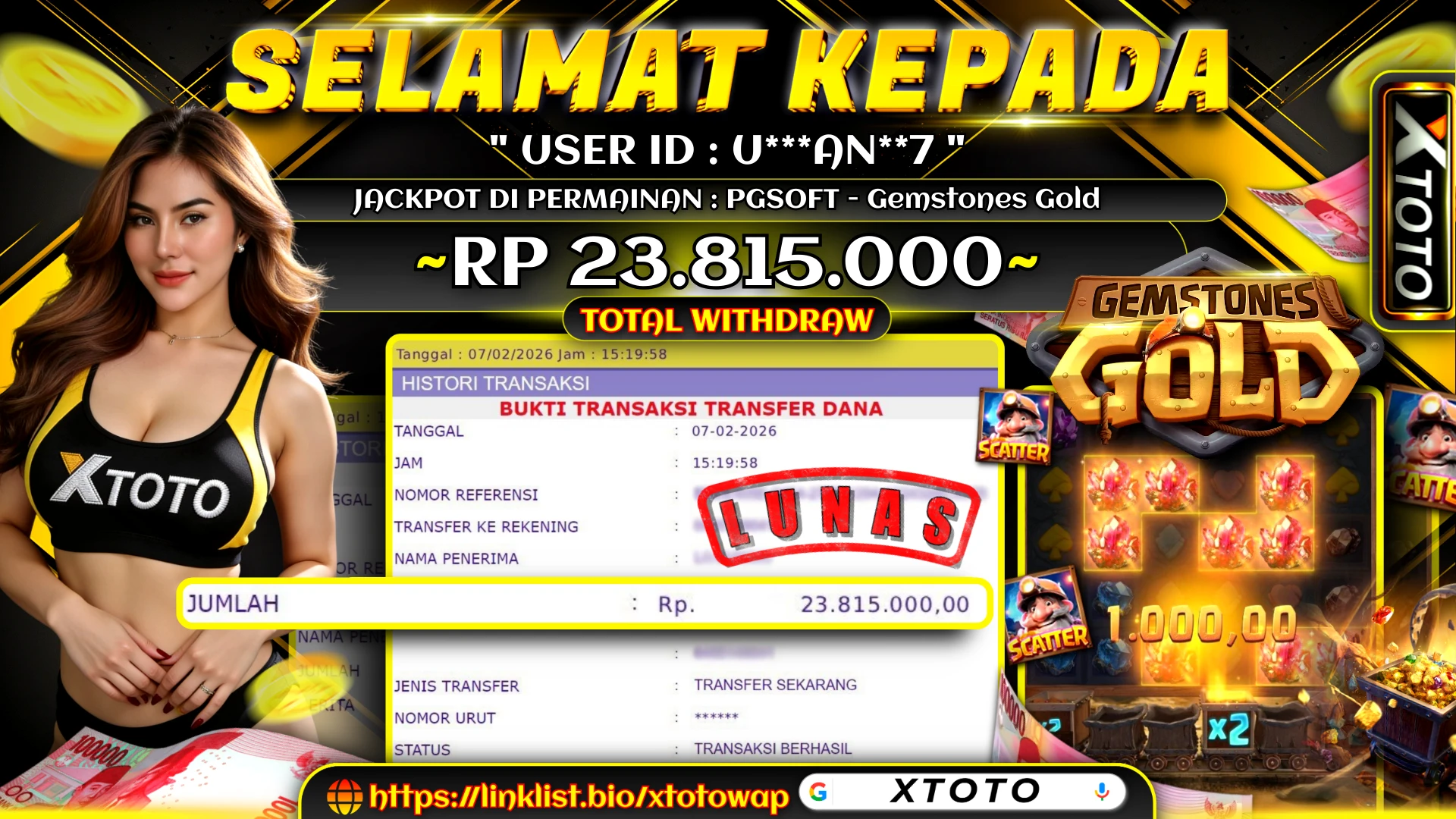 Selamat kepada U*******7 karena telah memenangkan jackpot senilai Rp. 23,815,000