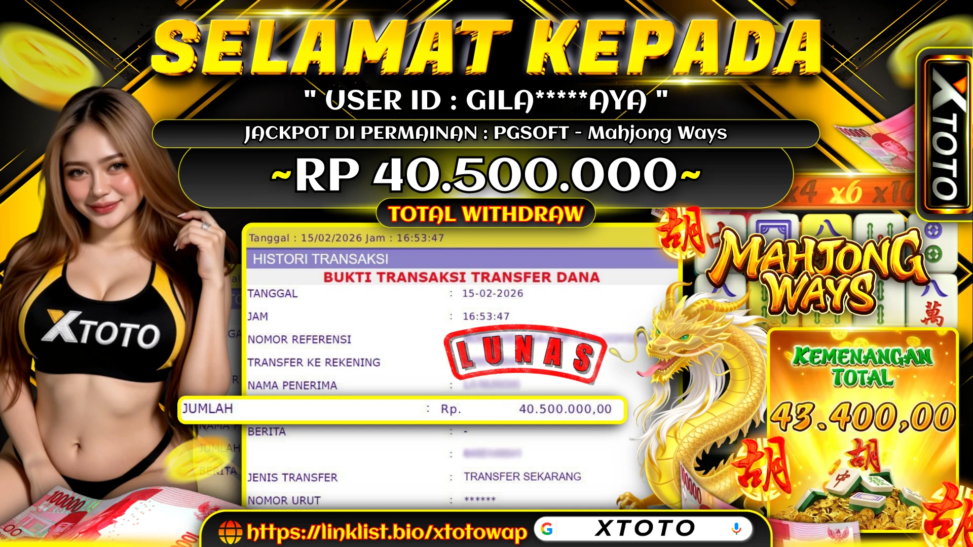 Selamat kepada GI*******AYA karena telah memenangkan jackpot senilai Rp. 40,500,000