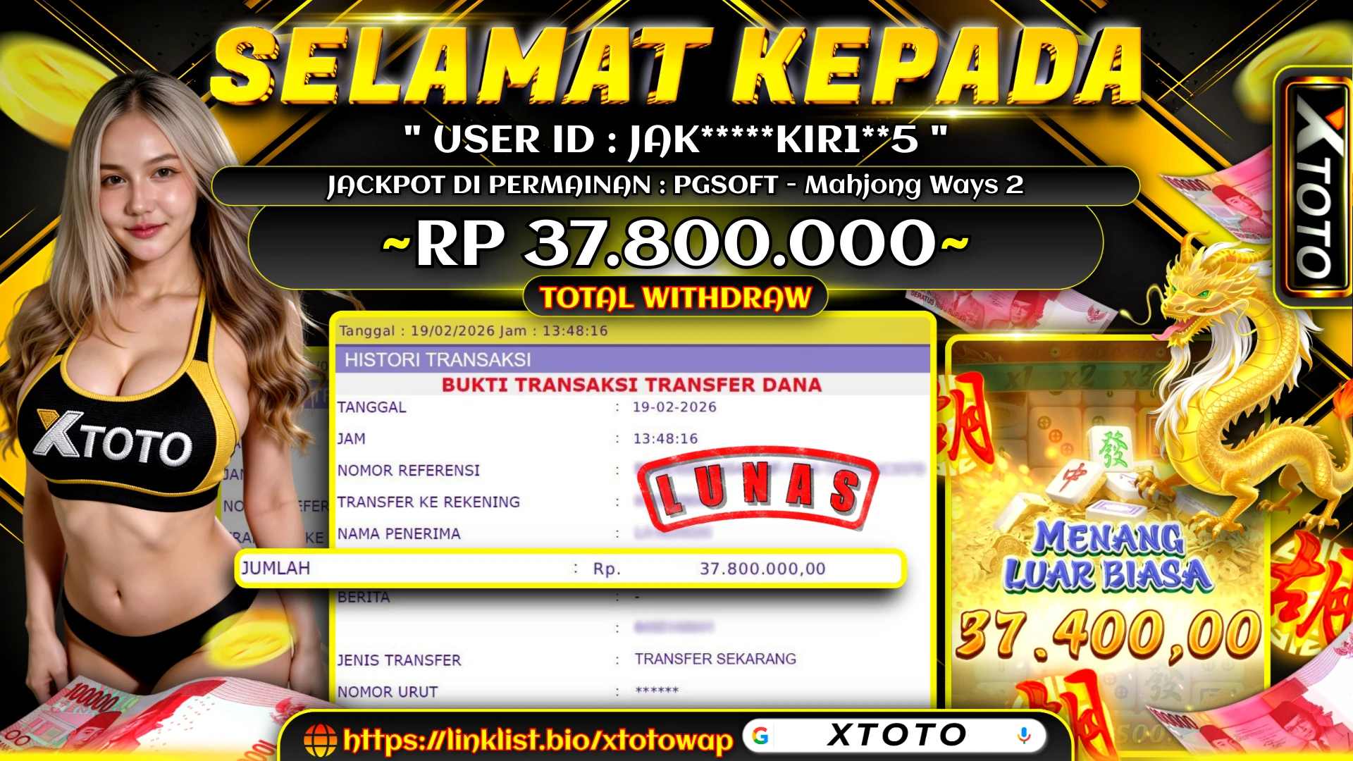 Selamat kepada JAK***********5 karena telah memenangkan jackpot senilai Rp. 37,800,000