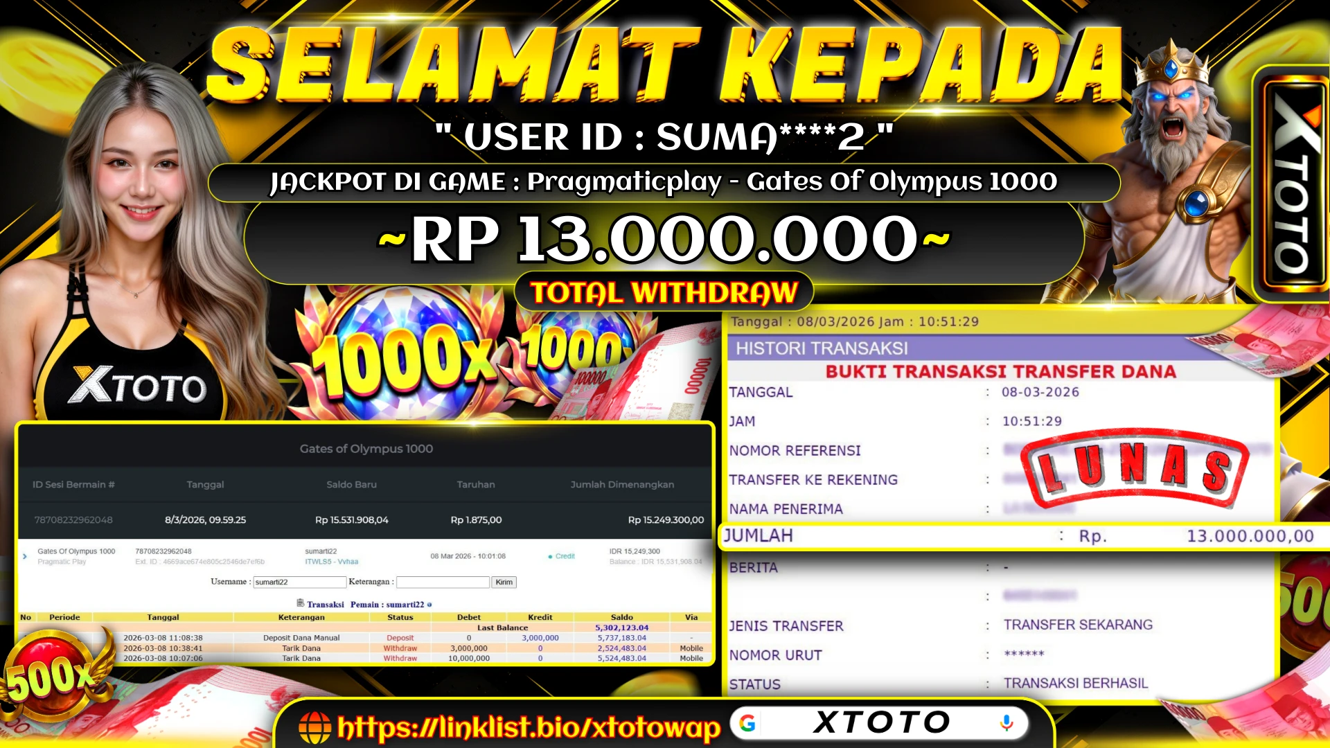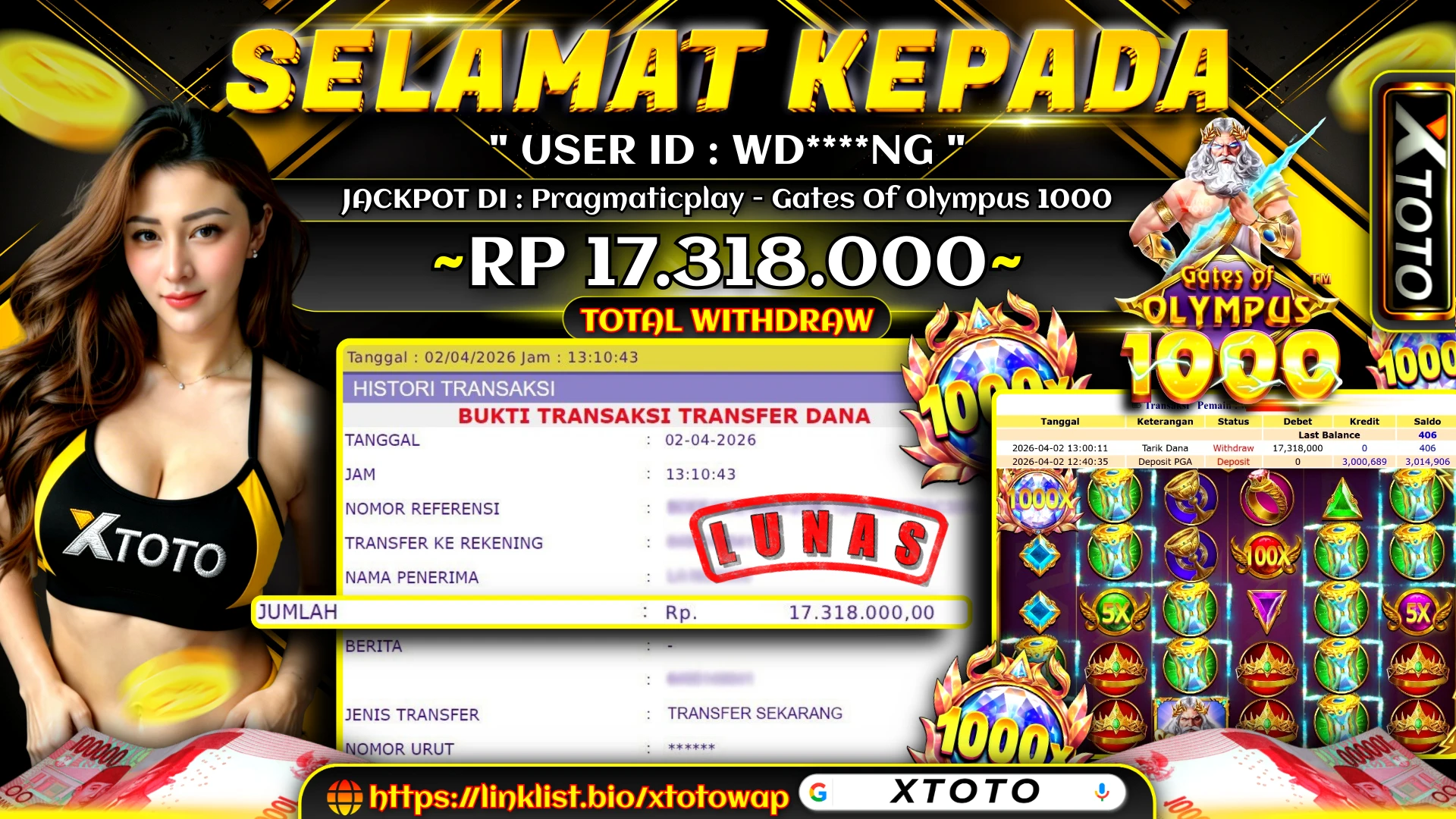 Lihat DetailXTOTO | MENANG SLOT PRAGMATICPLAY - GATES OF OLYMPUS 1000 13,000,000 LUNASS ⚡⚡⚡
