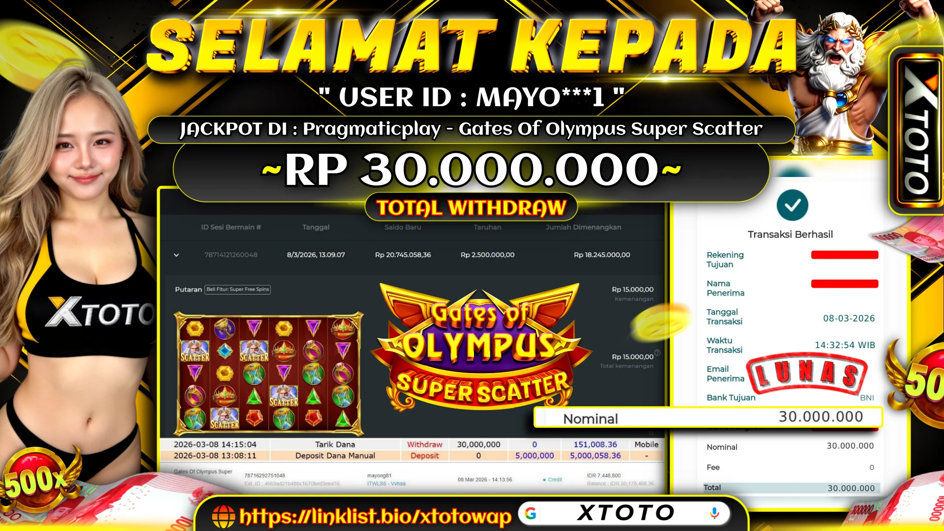 Lihat DetailXTOTO | MENANG SLOT PRAGMATICPLAY - GATES OF OLYMPUS SUPER SCATTER 30,000,000 LUNASS ⚡⚡⚡