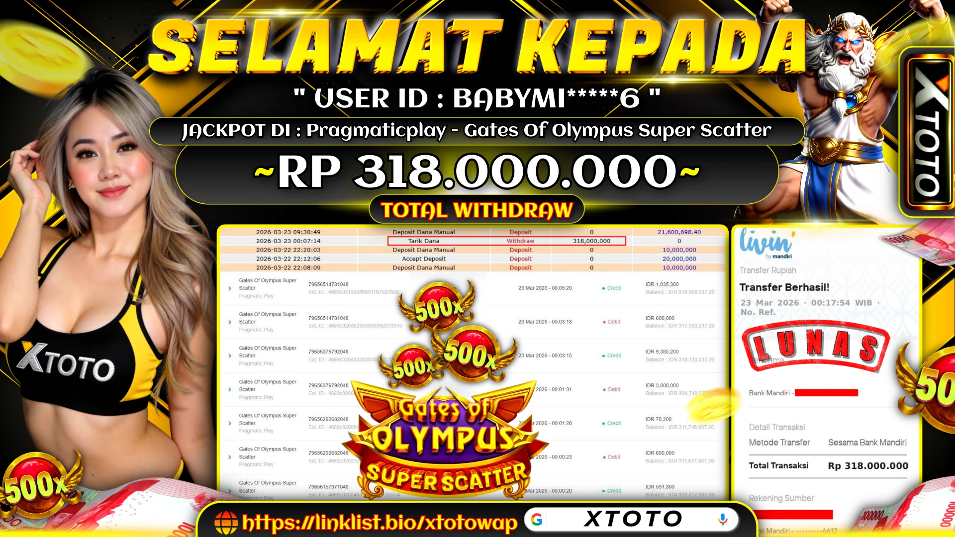 Lihat DetailXTOTO | MENANG SLOT PRAGMATICPLAY - GATES OF OLYMPUS SUPER SCATTER 318,000,000 LUNASS ⚡⚡⚡