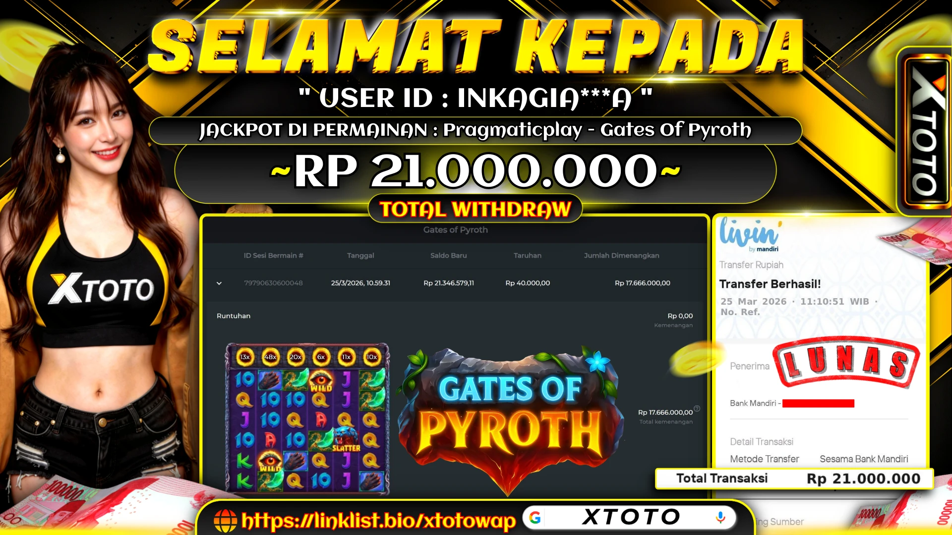 Lihat DetailXTOTO | MENANG SLOT PRAGMATICPLAY - GATES OF PYROTH 21,000,000 LUNASS ⚡⚡⚡