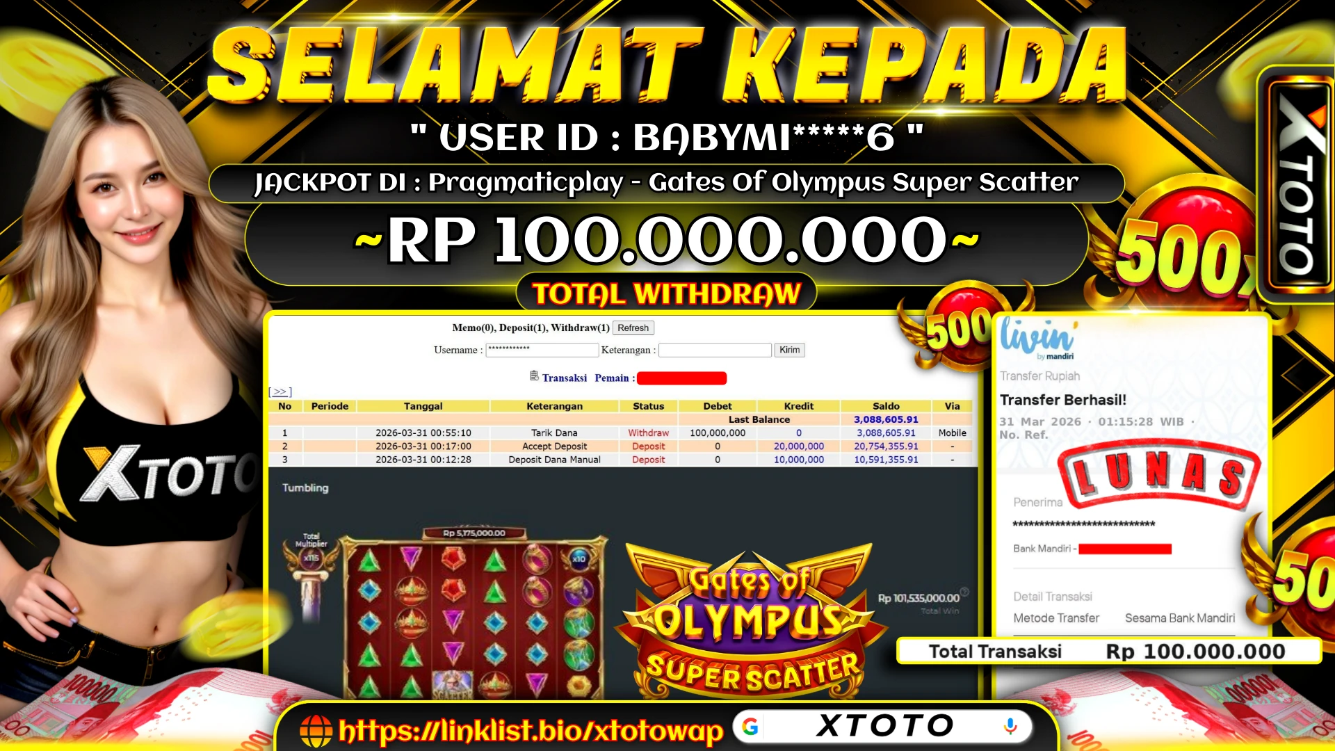 Selamat kepada BA*********6 karena telah memenangkan jackpot senilai Rp. 100,000,000