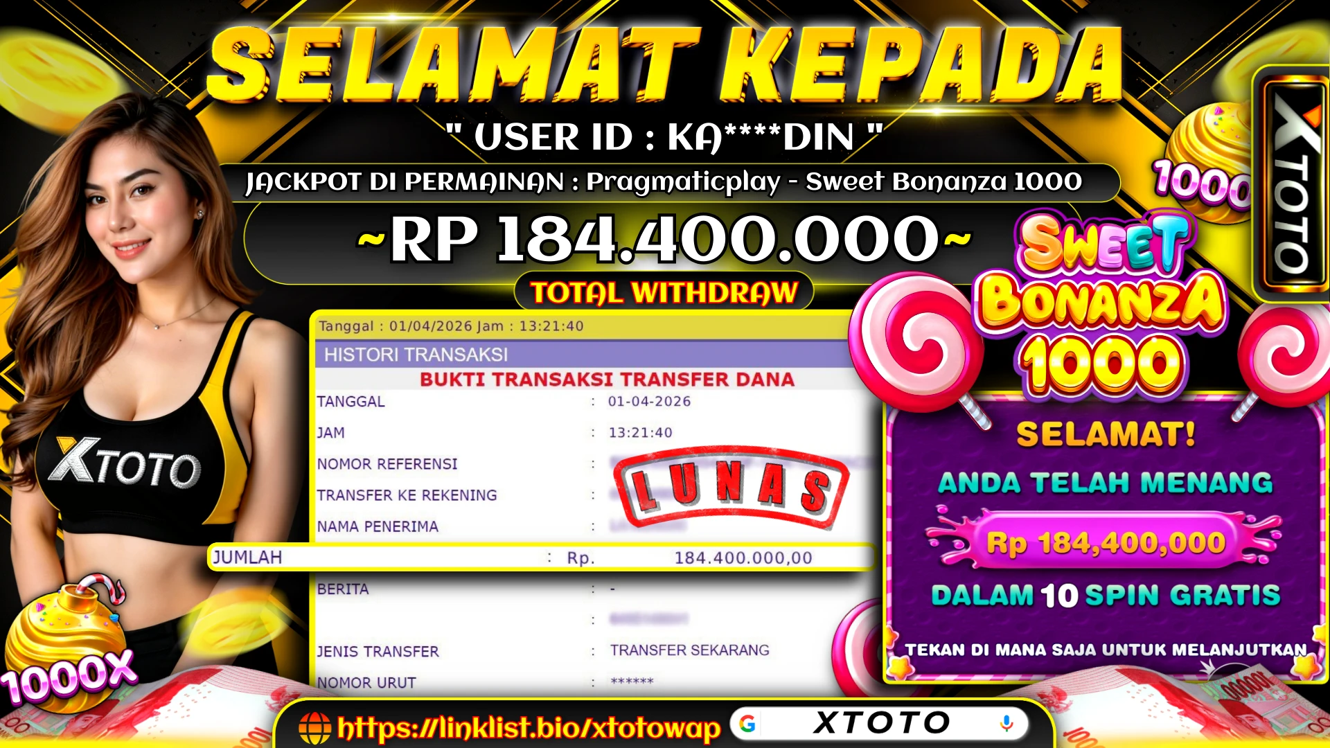 Lihat DetailXTOTO | MENANG SLOT PRAGMATICPLAY - SWEET BONANZA 1000 184,400,000 LUNASS ⚡⚡⚡